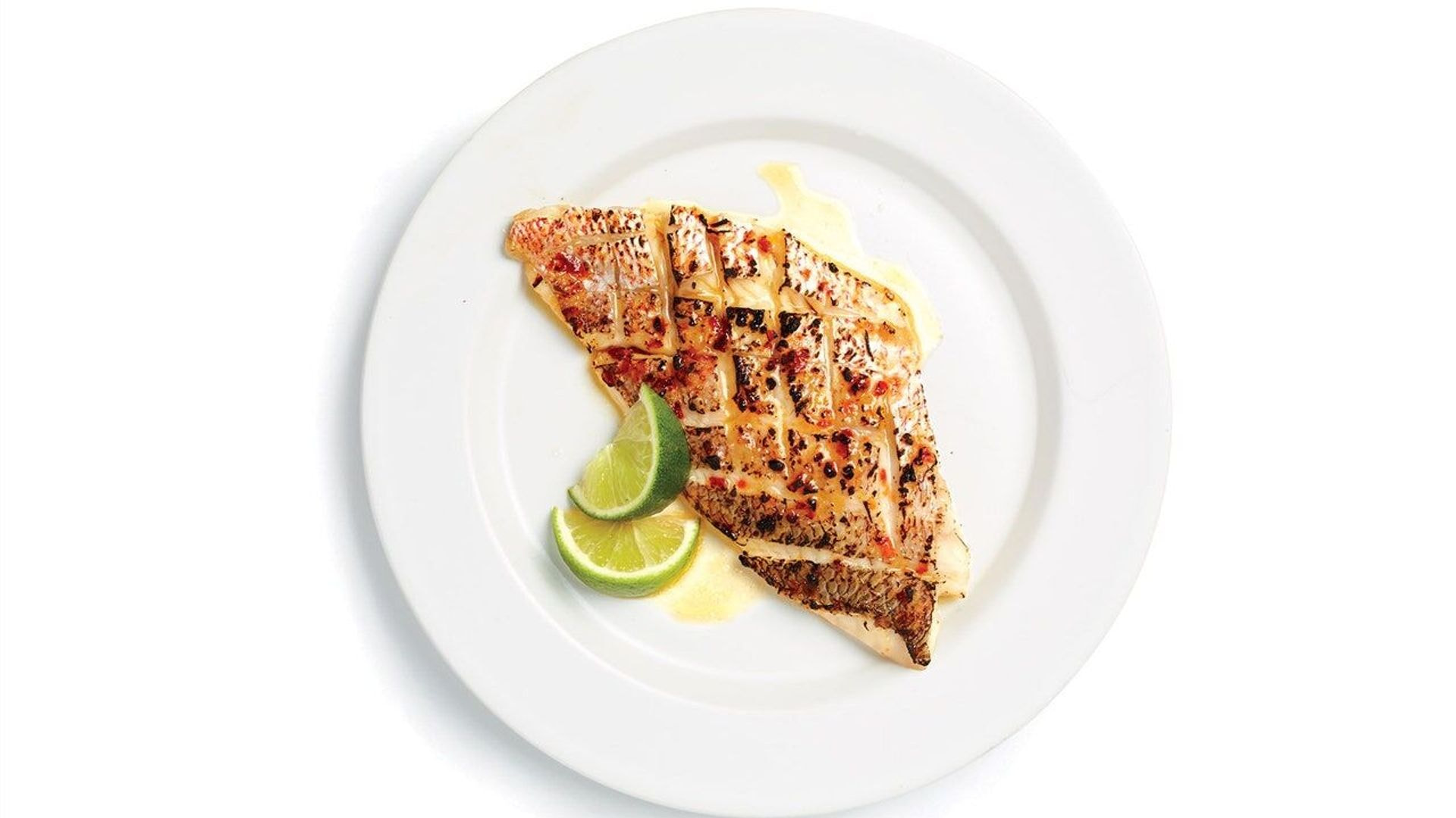 Heat broiler. Drizzle snapper with oil and broil until charred in spots and cooked through, about 5 minutes. Serve with lime wedges for squeezing over.